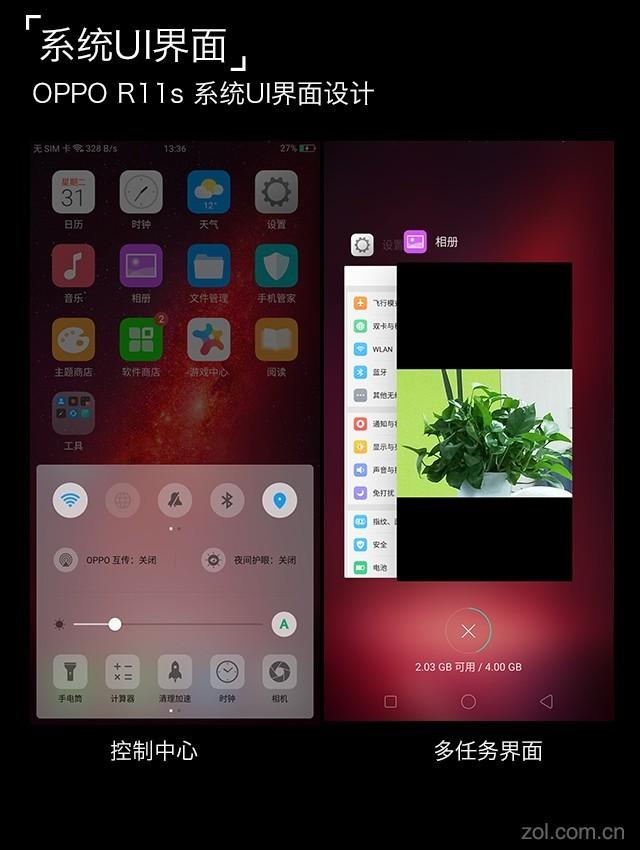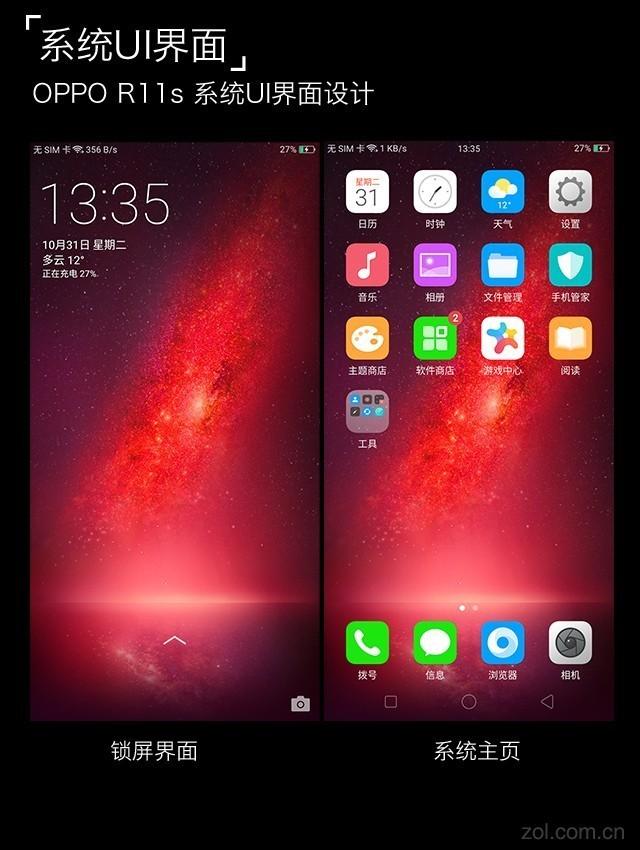 OPPO R11s采用了基于Android 7.1.1的ColorOS 3.2,自从ColorOS 3开始OPPO的UI风格就变成了这种以效率为重的简明轻快风;系统图标的色彩重绘,UI的页面字体也在大小、颜色上面的经过了精心调试,以求用更佳的对比度呈现信息。