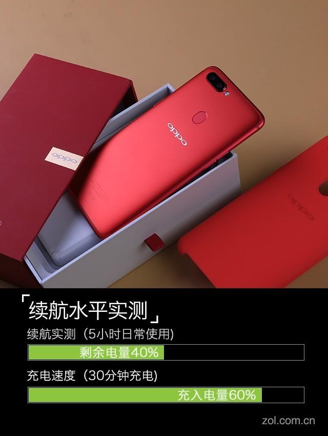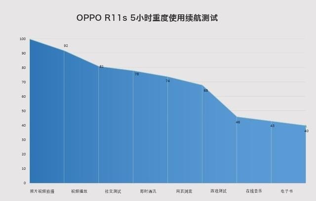 而续航部分除了OPPO R11s除了在7.1mm的轻薄机身内塞入了3205mAh容量的电池之外,多年的VOOC闪充自然也是标配;测试成绩上5小时持续使用后剩余电量40%,闪充5V/4A的配置能在半小时内充满60%的电量。