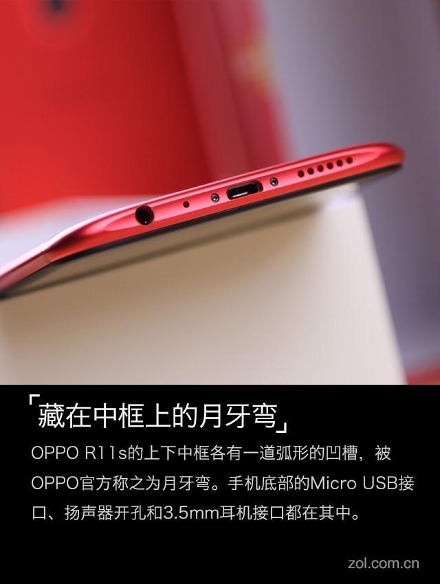 在解决了正面和背面的矛盾之后,OPPO R11又将目光放到了我们容易忽视的手机上下中框上——OPPO R11s的上下中框各有一道弧形的凹槽,被OPPO官方称之为月牙弯。包括Micro USB接口、扬声器开口和3.5mm耳机接口在内的开孔都整合到这个月牙弯之中。在R11中通过隐藏传感器开孔解决了前面板的一体化问题之后,OPPO R11s把横亘在手机一体性提升的最后一个门槛——中框一体性也给出了自己的解决方案。