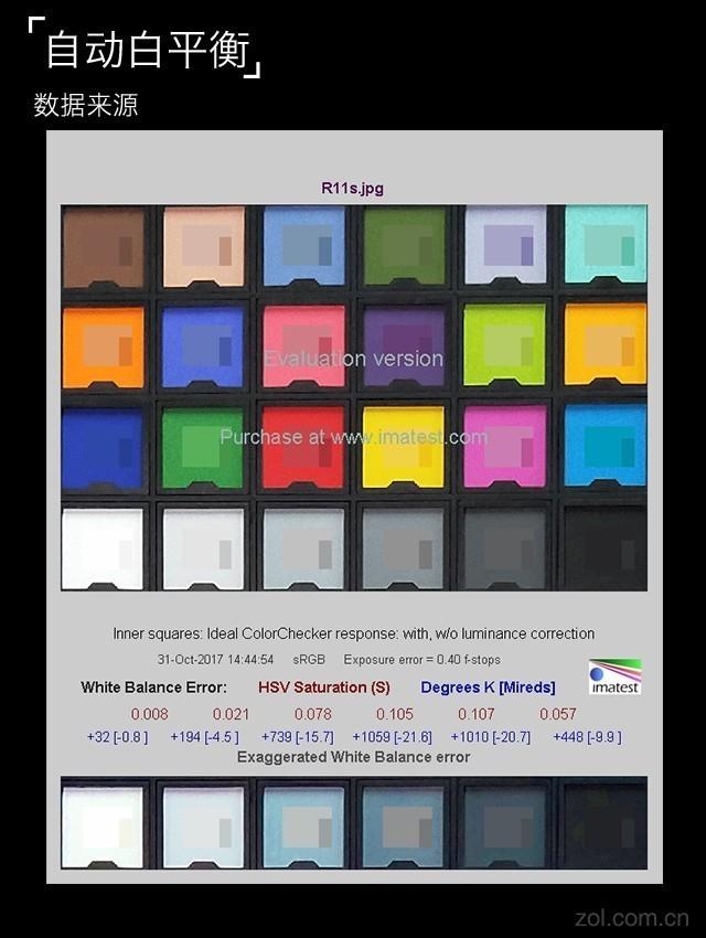 拍摄棚拍环境中的24 Color Check测试卡,通过Imatest分析得出色彩偏离值ΔE以及白色HSV饱和度。色差ΔE其实就是所测颜色与真实颜色间的差距,差距越大,偏色越严重。
