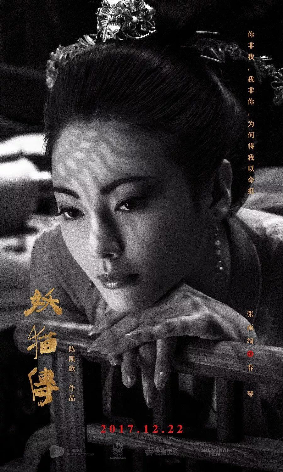 再说《妖猫传》的三个人物。在之前公布的「黑白光影」版海报中,对这三个女性,都有一句判词。如同太虚幻境对十二金钗的判词一般,在开始就已经钦定了她们的命运。他梦中的每个人,都能在陈凯歌过往的女性角色中,找到一些呼应感。