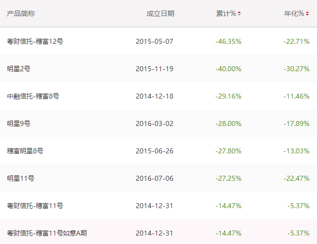据私募排排网数据显示,目前穗富投资运行的13只私募产品中,有10只产品收益为负,其中“粤财信托-穗富12号”累计亏损46.35%。