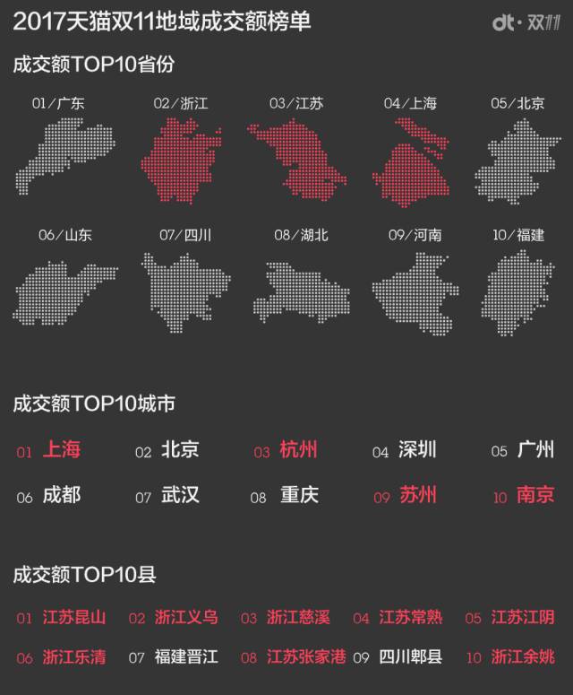 但无论怎么扩张,包邮区始终地位超然。在截至11月11日18时的省份成交额榜单中,包邮区紧紧占据了二三四把交椅,仅次于人口大省广东;而在成交额前十城市中,包邮区也包揽四席。