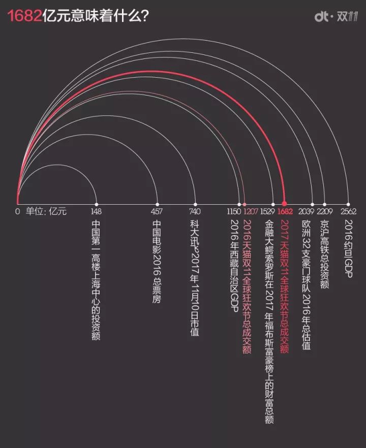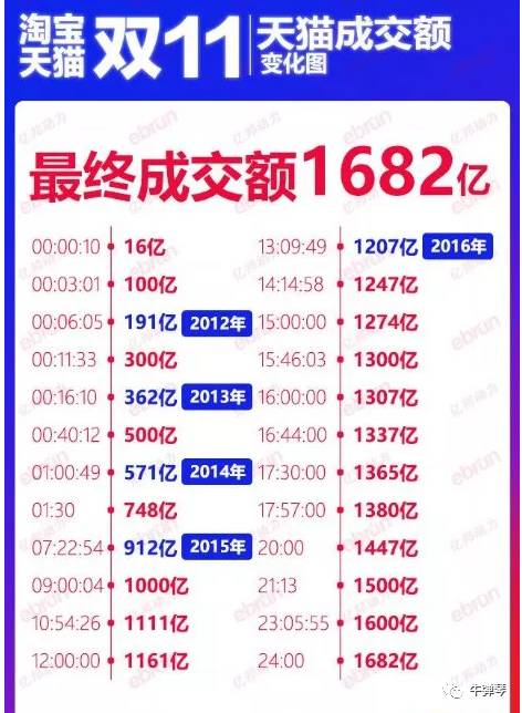 截至2017年11月11日24点,天猫双十一最终成交总额为1682亿元。