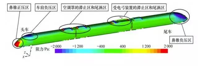 空气阻力由三部分组成:一是列车车头迎风受到的正面压力,列车尾部由于空气尾流引起空气稀薄而产生的向后的拉力,这样由于头部及尾部压力差形成的阻力称为压差阻力;二是由于空气粘性而引起的作用于车体表面的摩擦阻力;三是有车辆转向架、车顶设备、门窗、车厢间链接风挡等车辆表面凹凸结构引起的干扰阻力。