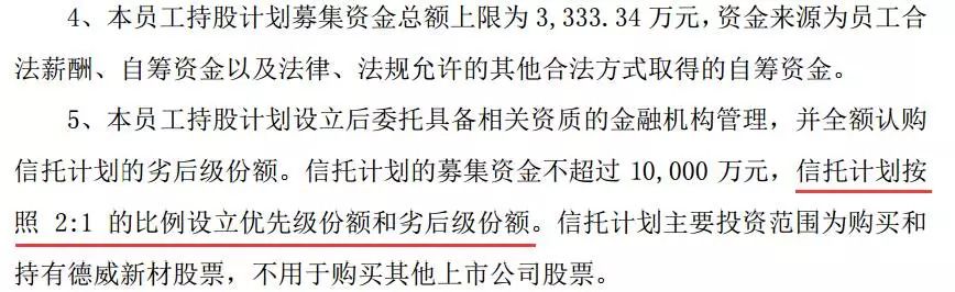 查阅德威新材员工持股计划可以发现,德威新材的员工持股计划资金来源分为优先/劣后:信托计划的募集资金不超过10000万元,信托计划按照2:1的比例设立优先级份额和劣后级份额。信托计划主要投资范围为购买和持有德威新材股票,不用于购买其他上市公司股票。