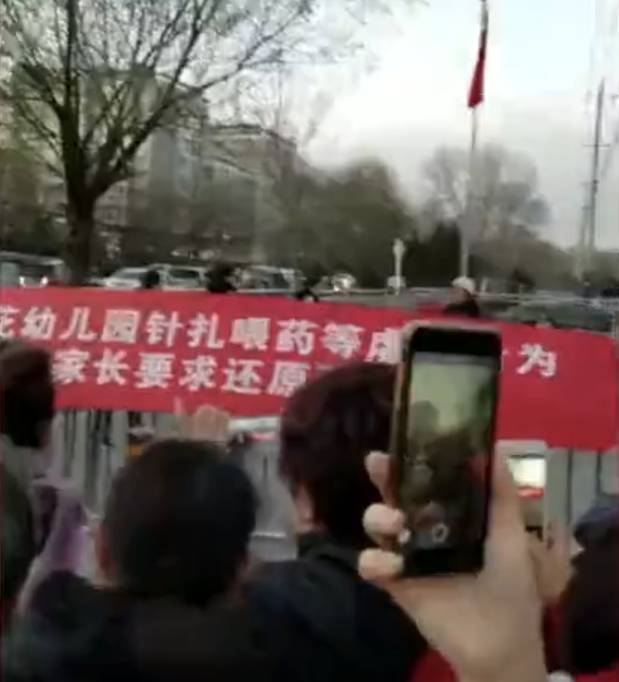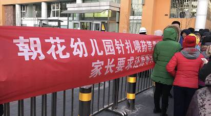 话说回来,面对小二班家长们在幼儿园门外打出的横幅,因为当时正值其他班孩子放学,最终来安抚这些家长的是当地派出所的民警。朝花幼儿园的园长与入驻幼儿园的朝阳区教委人员并未现身。