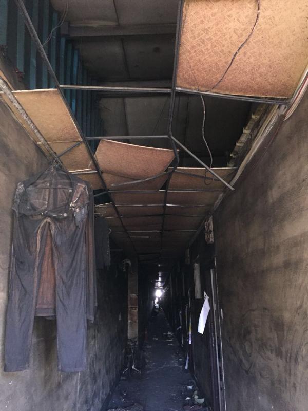 澎湃新闻在公寓内观察到,公寓的墙体和物品均被烟熏黑,整个公寓内依然有很浓刺鼻毒气味道,楼道里摆放的衣服已经被烟气和毒气熏到发黑发烂。狭窄的安全通道内杂乱无章,部分房间内还有许多租户遗留下来的物品,部分房间贴上了封条,楼道内顶棚有许多坠落物,地下一层冷库已被封锁,公寓旁的门诊和饭店均已关闭,公寓内仍还有租户留下的物品。