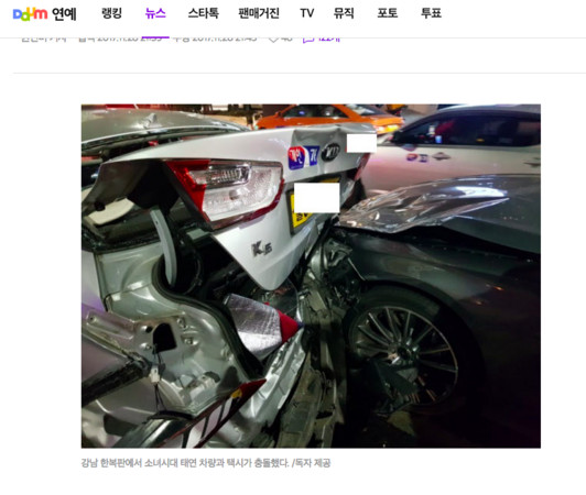 据台湾《东森新闻云》报道,少女时代队长泰妍于28日驾驶豪车,在首尔江南区与出租车发生追撞,对方再撞上前方的奥迪车辆,造成连环车祸事故。幸好并未造成人员伤亡,泰妍所属经纪公司SM娱乐做出声明,对“泰妍驾驶不注意造成事故”表达歉意。不过泰妍曾经在《一周偶像》展示过开车技术,她本人也对此相当有信心。
