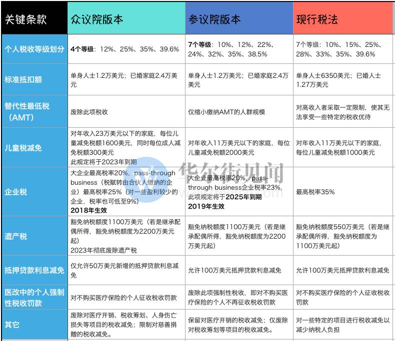 除了在抵押贷款利息减免这一项上众议院的征税要求更为苛刻之外,几乎都是参议院版本更为严格。