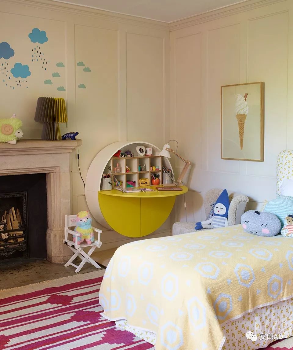 Clementine房间里的冰激凌甜筒摄影作品来自Luke Stephenson,床头和床上用品的麻布面料来自Christopher Farr,书桌来自Space & Shape,w地毯来自Robert Stephenson。