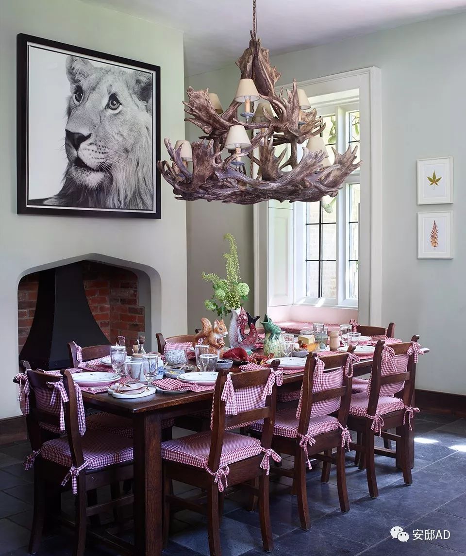 餐桌一侧挂着来自Patrick Demarchelier的狮子题材摄影作品,餐具来自Bordallo Pinheiro Ceramics和Villeroy & Boch。玻璃用具来自Daylesford,座椅靠枕采用格子棉布制成。