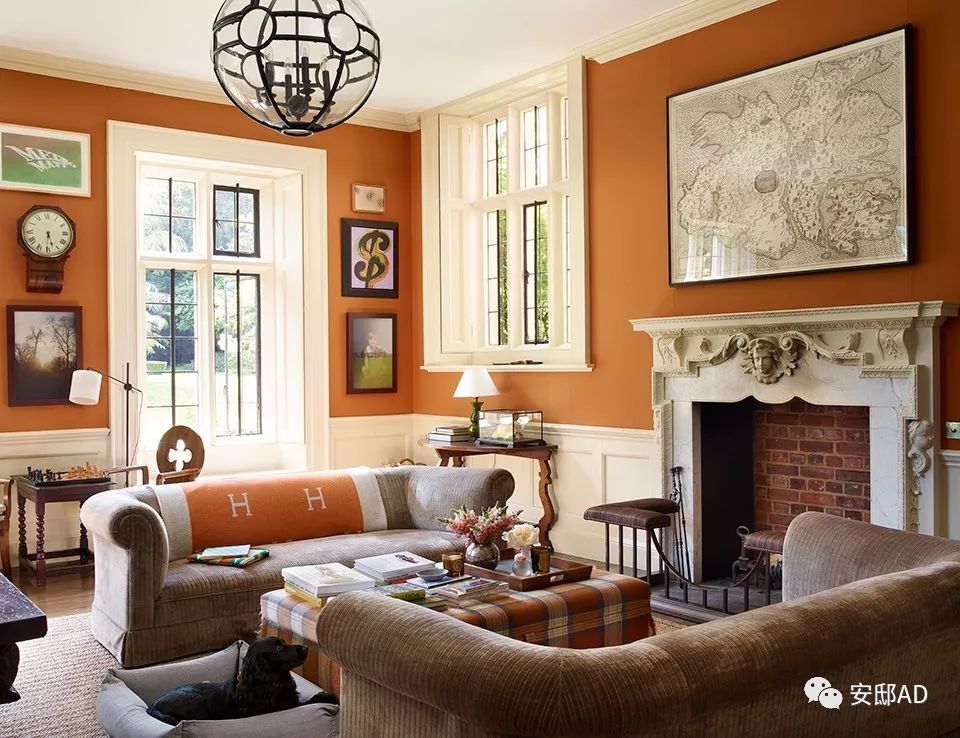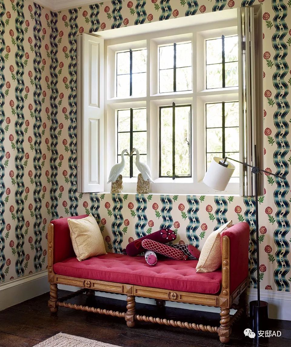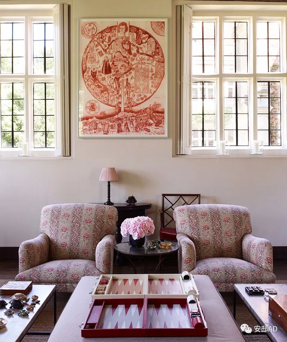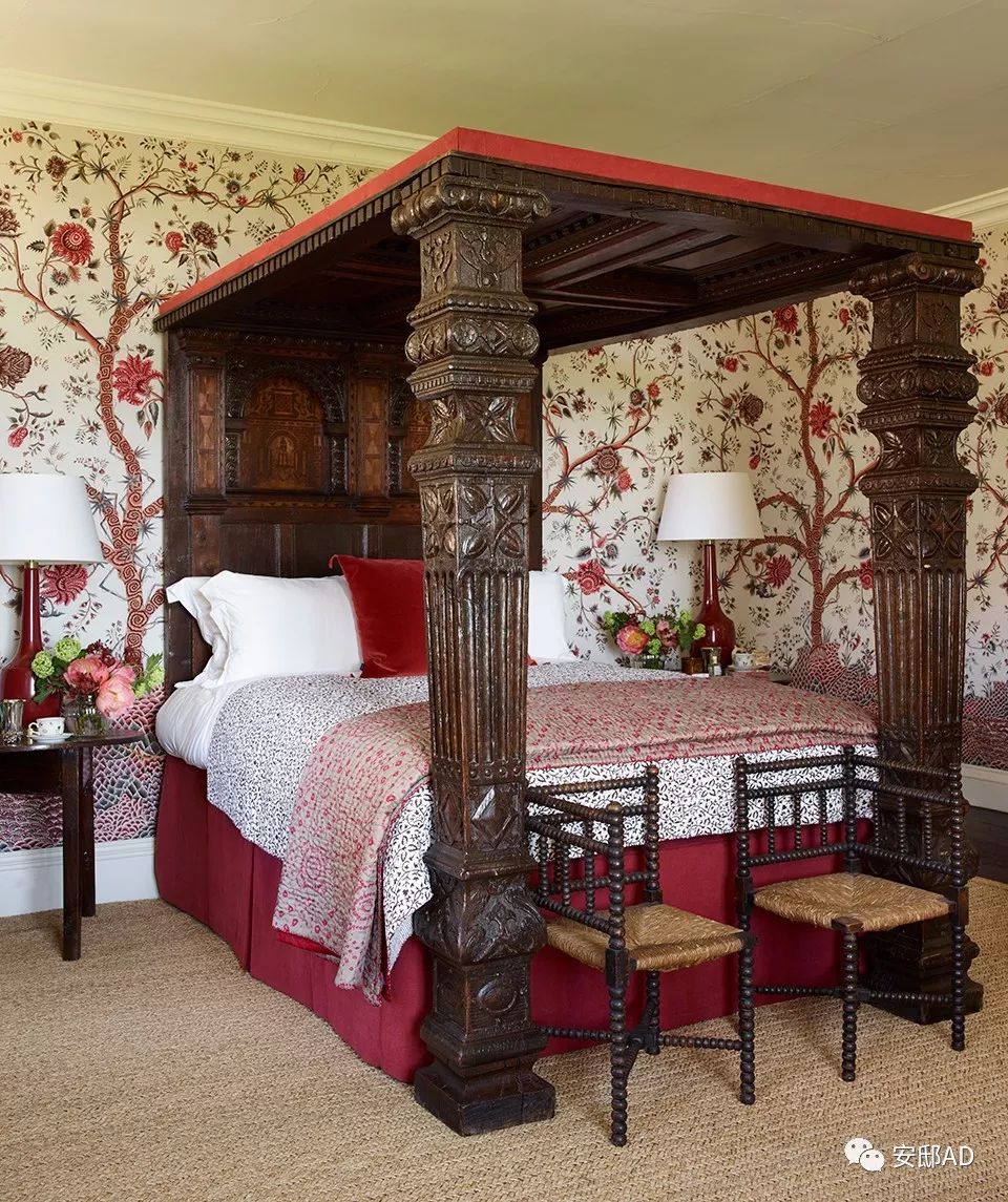 一些面料舒适的家具、古董和传家宝构成了这里的大部分家具与摆设。“恢弘的住所通常会少一些个性,”Schiffer说,“我希望室内能有一些承载我们美好回忆的重要物件。”她说,比如,客厅的橡木柜是她童年时家里使用的,门厅墙上挂着她丈夫的家族盾牌与长剑。“重要的是这些东西背后蕴含的故事。”“我们还大量使用颜色和图案。”Schiffer说。几乎每一间客房的墙壁上都有不同的传统主题装饰——有的房间使用“生命之树”主题面料,有的铺上了果园图案的印花墙纸。在Schiffer的坚持下,其中一间卧室从地面到天花板都铺满了Galbraith & Paul的深红色莲花墙纸,看起来就像一个美轮美奂的帐篷。