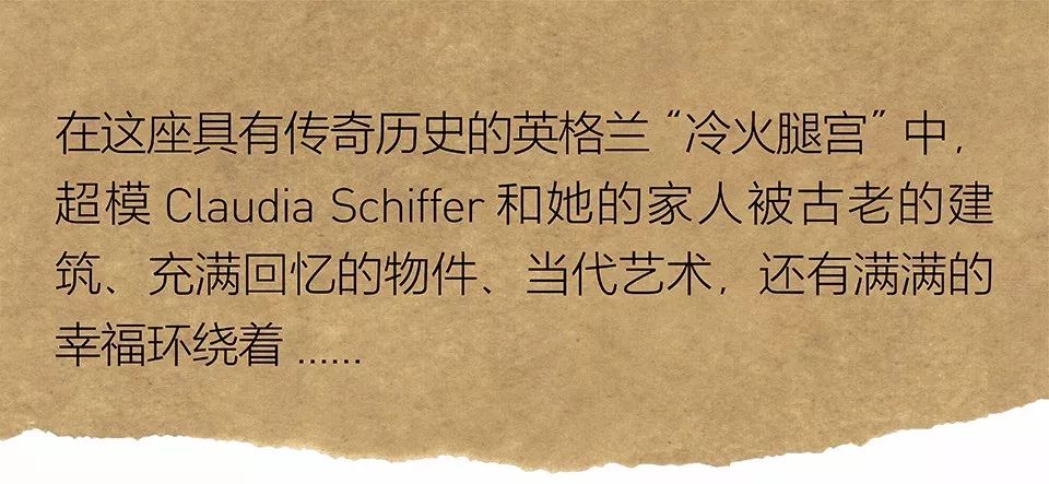 身为最早的超模之一,Claudia Schiffer的人生道路和她在T台上的表现一样一帆风顺。她曾是Guess品牌代言人,数不清登过多少杂志封面,还是一位成功的商人。15年前,她的丈夫、日耳曼裔英国导演Matthew Vaughn一次无意间驶过一栋古宅,兴趣使然,找到了屋主,问他愿不愿意卖掉这里。最后,在Schiffer的感染下,夫妻两人顺利拿下了这里。“我们真的就是直接敲开门,单刀直入地跟对方说‘我们太喜欢这儿了’,”她回忆着当时奇妙的场景,“屋主完全不知道我们是谁、在这儿干什么。”几个月后,Schiffer和Vaughn与屋主顺利完成了房产归属交割,并在这里当着120名客人之面交换誓言,正式结为夫妻。