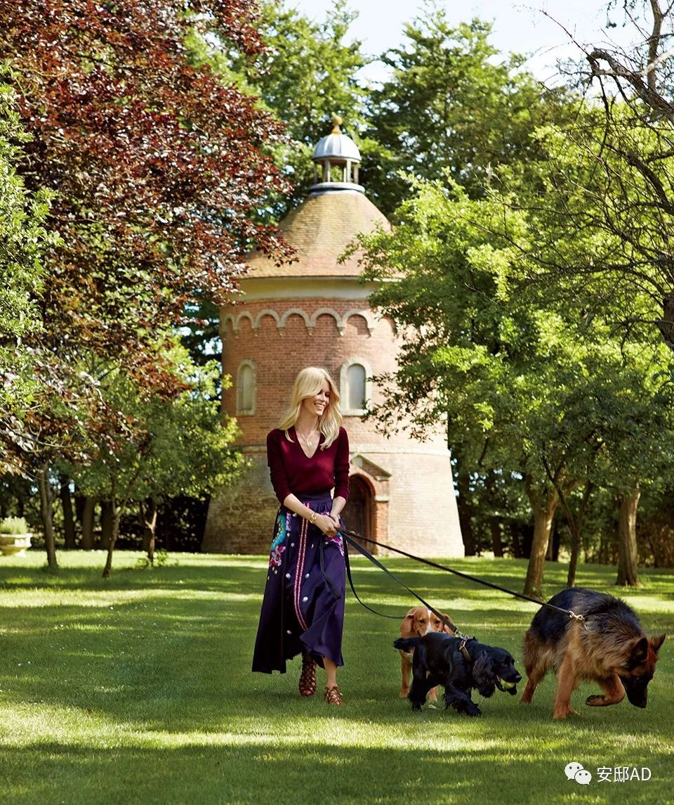 主人:Claudia Schiffer,德国超模、演员、时装设计师。她出生于1970年,曾在1990年代成为全球最成功的模特之一,2002年以拍摄过最多杂志封面的模特入选吉尼斯世界纪录(www. claudiaschiffer.com)。图为Schiffer和三只宠物狗在一起。上衣来自她个人品牌,裙子来自Temperley London,鞋子来自Aquazzura。