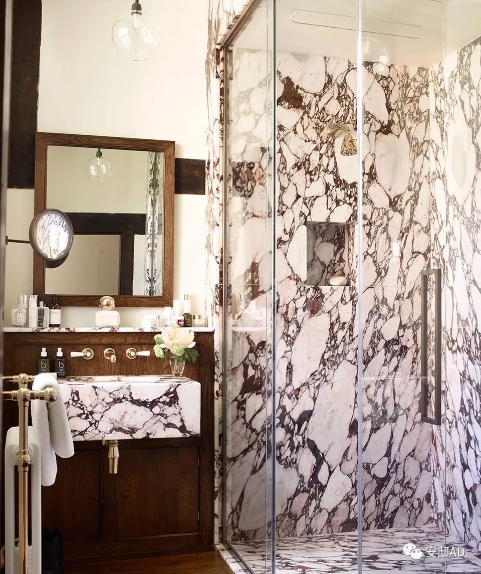 主浴室的定制大理石管材和喷头由Benningen Lloyd设计。配件来自Lefroy Brooks,毛巾架来自Bard & Brazier Ltd。香皂来自Bamford。