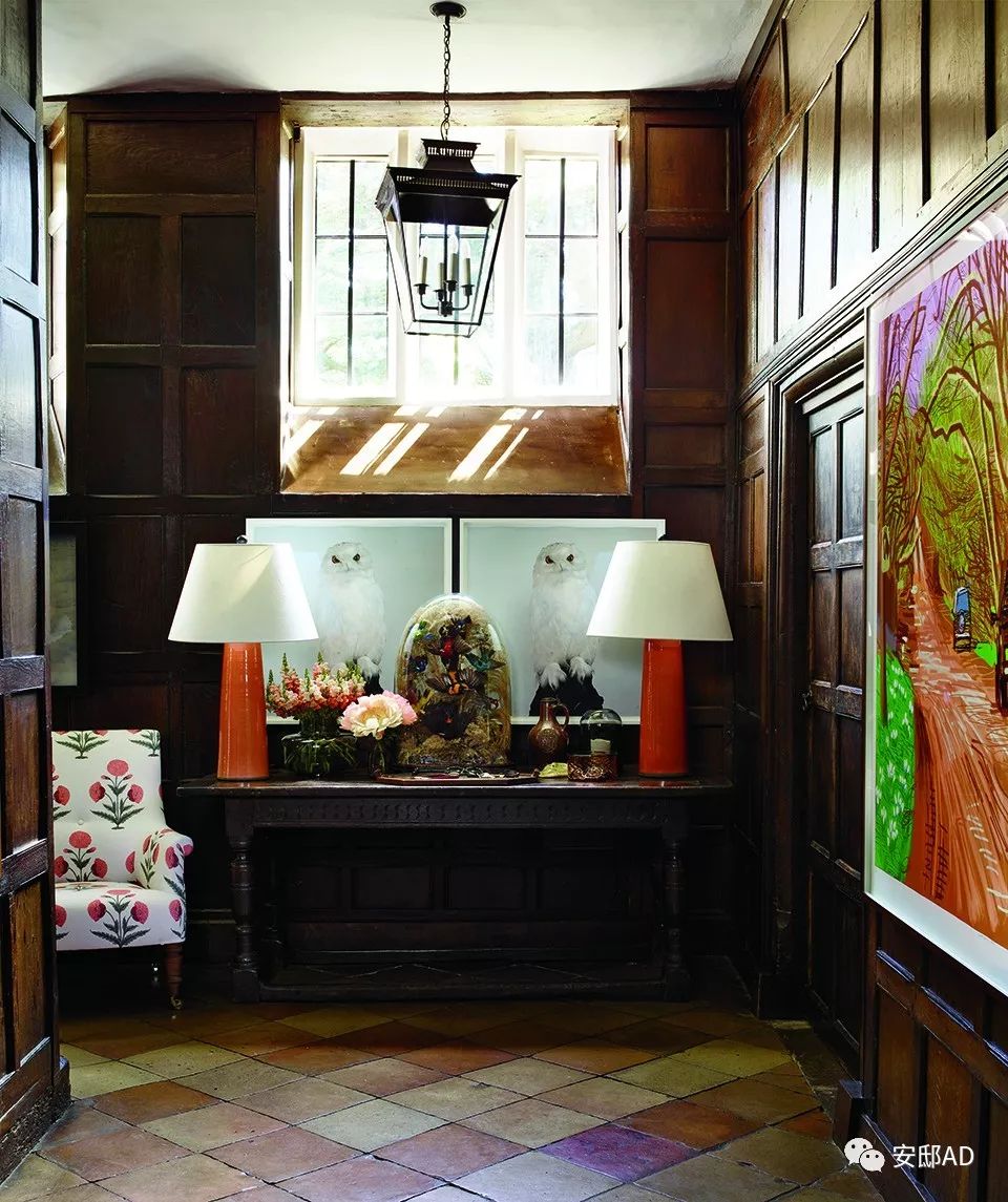 这栋16世纪的都铎别墅门厅藏有Roni Horn和David Hockney的艺术品。吊灯来自Vaughan,座灯来自Currey & Co。Pimpernel & Partners出品的座椅采用了Christopher Moore的罂粟花麻布面料。