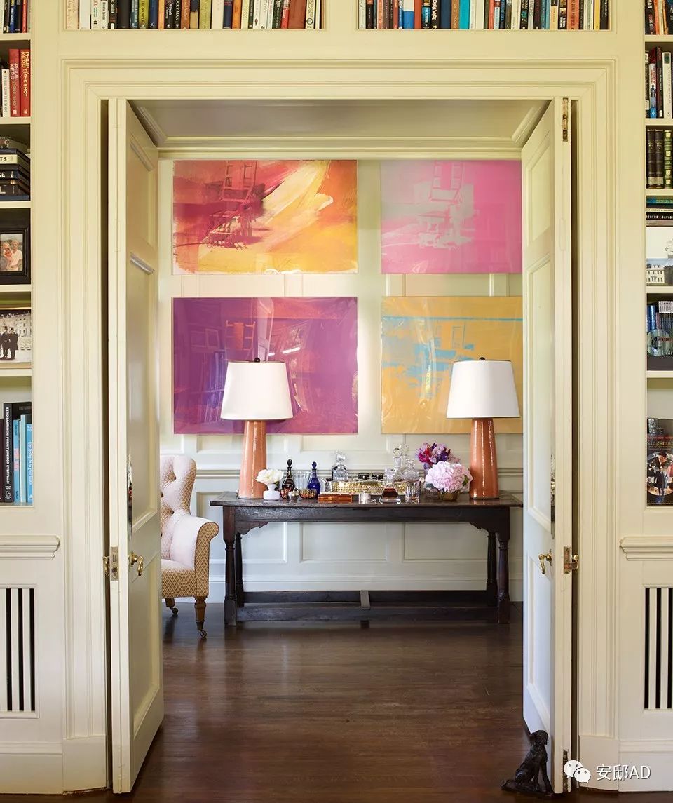 Schiffer收藏的彩色画作点亮了空间,古董桌上的鲜花正在绽放,满满都是幸福感。