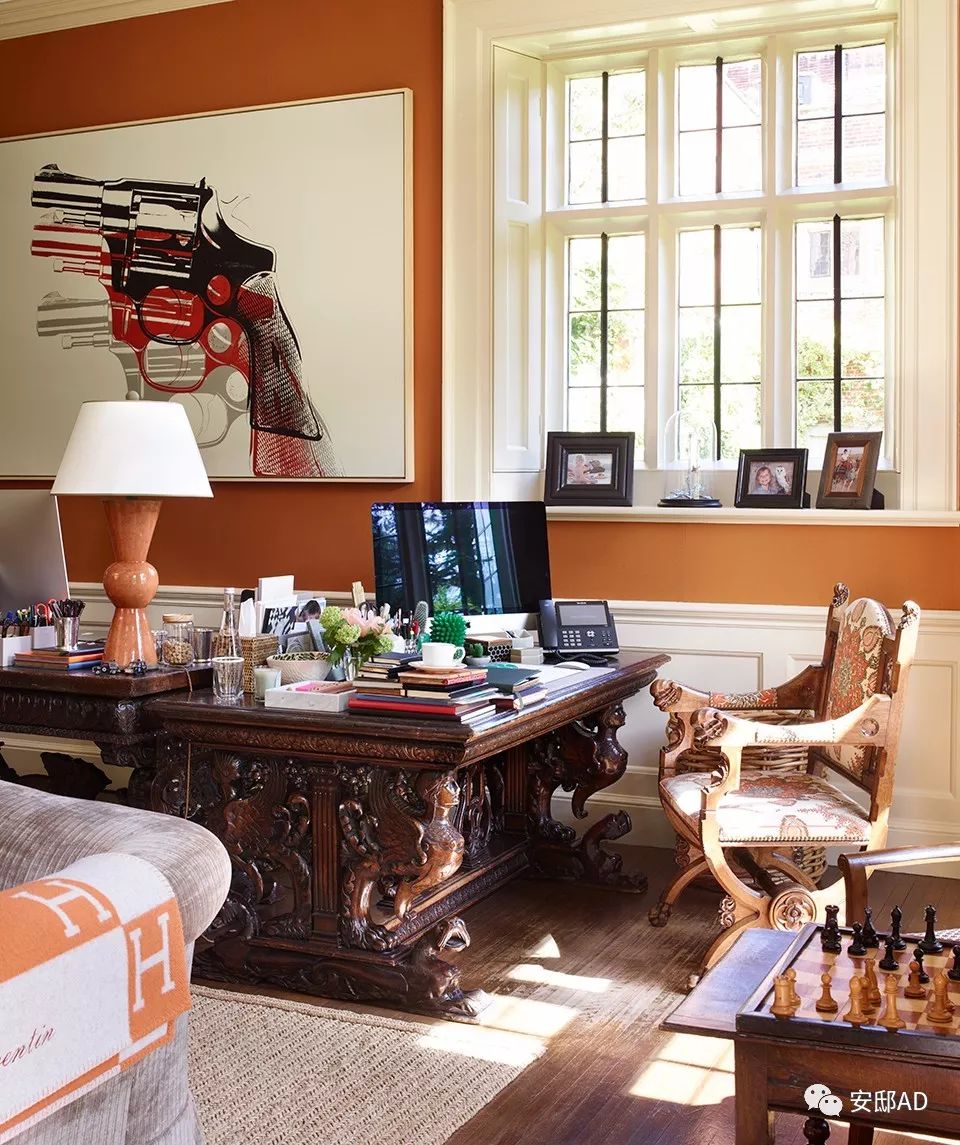 书房里,线条复杂的古董木桌和木椅搭配一张手枪题材的现代艺术作品,看起来恰到好处!窗台上还放满了家人的合影。