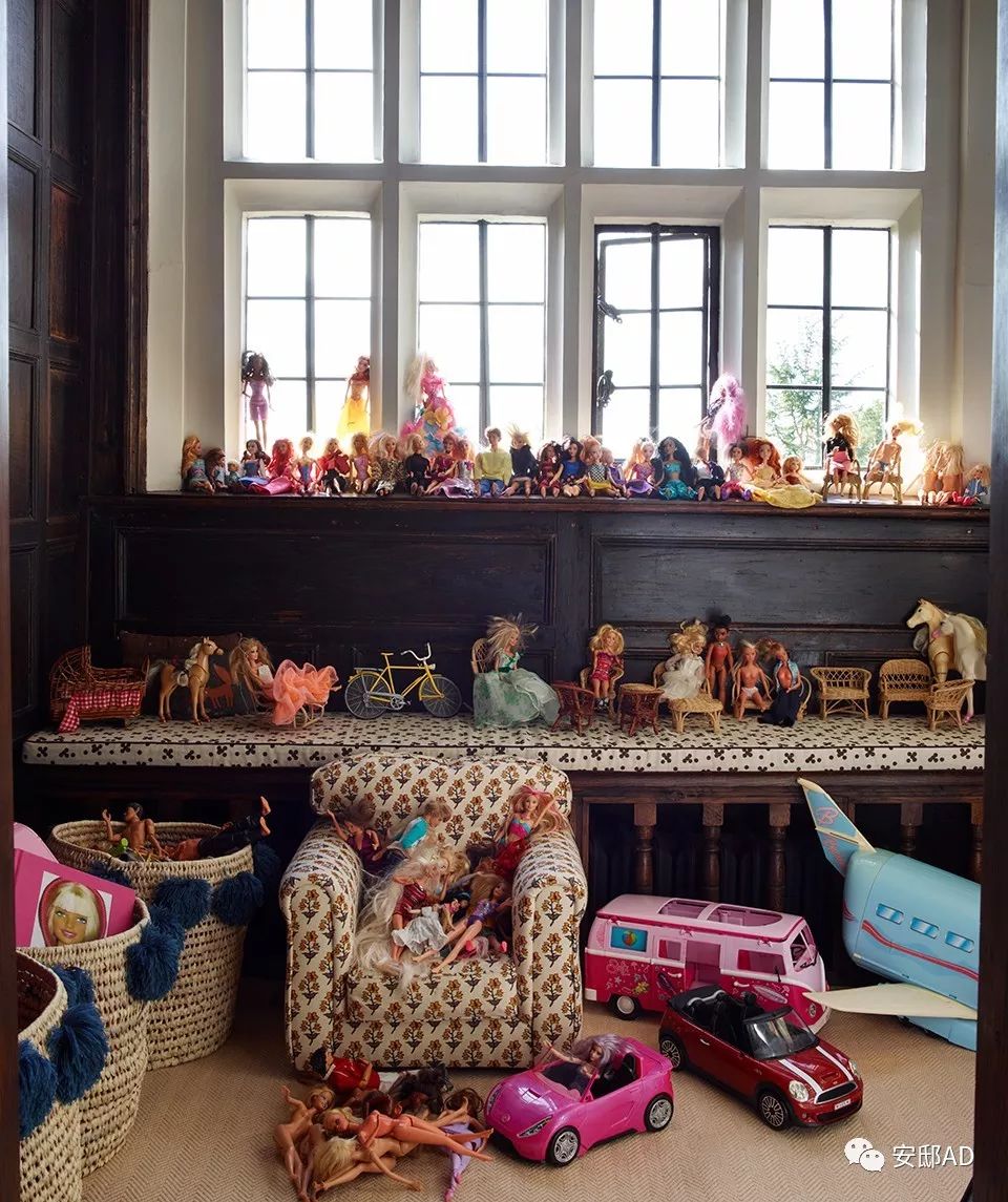 若干代的芭比娃娃,有一些来自Schiffer孩提时代的收藏,现在都在Cosima的芭比房里。小沙发靠枕面料来自Christopher Farr,座椅面料来自Namay Samay。如今这些娃娃都悉数传给女儿,正如这悠久的房子本身,因为历任屋主的精心爱护,得以世代相传……