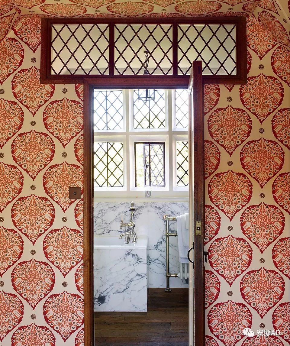 大理石浴缸,卧室外墙上的红莲花墙纸来自Galbraith & Paul。