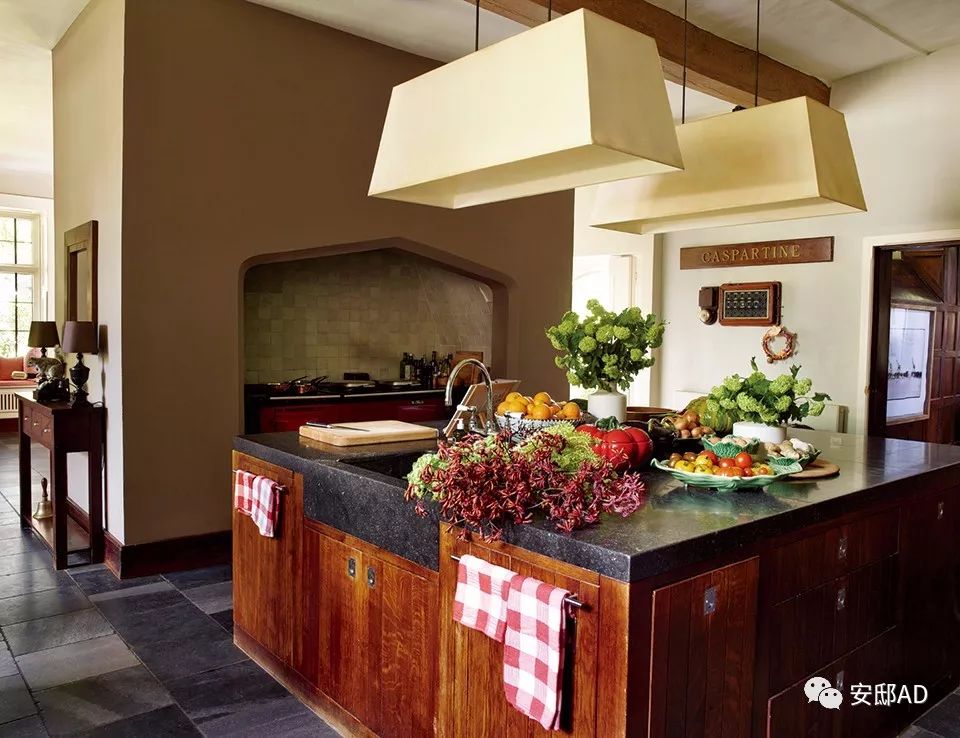 厨房工作台来自Aga和Generously。新鲜果蔬来自Cotswolds的Daylesford,红色方格茶巾来自Meyer-Mayor。