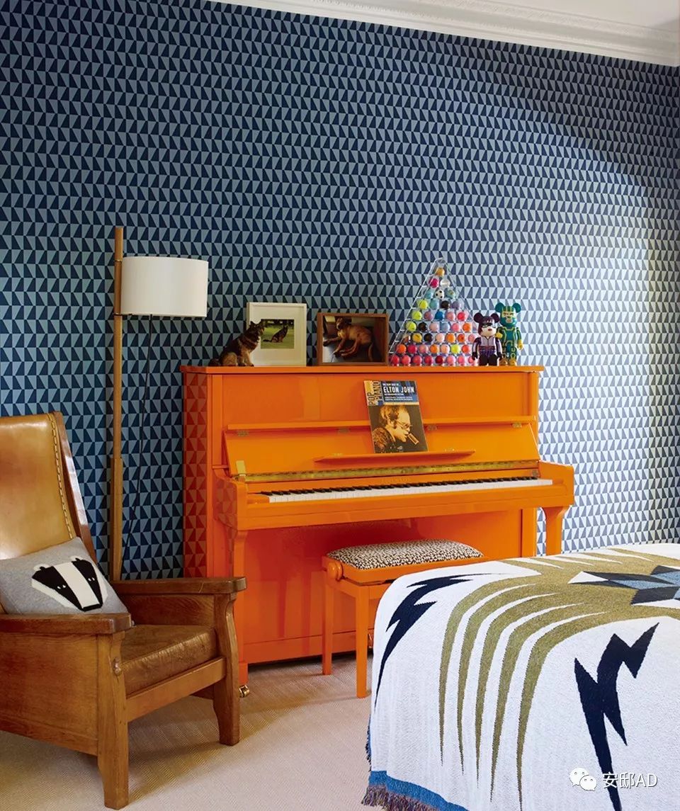 “我们还大量使用颜色和图案,几乎每一间卧室的墙壁上都有不同的壁纸或壁布装饰。”Caspar房间的蓝格墙纸来自Arne Jacobsen。定制喷漆的钢琴是Edelweiss的。古董座椅来自Robert “Mouseman” Thompson。床具来自Knight Mills。