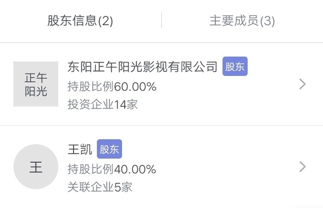 据国家企业信用信息公示系统显示,正午阳光在2016年2月与王凯合作成立得舍影视(天津)有限公司,注册资本为1000万元,正午阳光持股60%,王凯持股40%,法人代表为正午阳光董事长侯鸿亮。