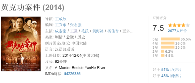 ▲电影《黄克功案件》豆瓣评分7.5分(图/豆瓣)