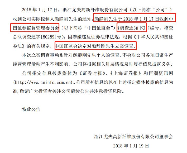 今日,富控互动、尤夫股份、宏达矿业三家上市公司集体公告,公司实际控制人颜静刚1月17日收到中国证监会的调查通知书,中国证监会决定对颜静刚进行立案调查。
