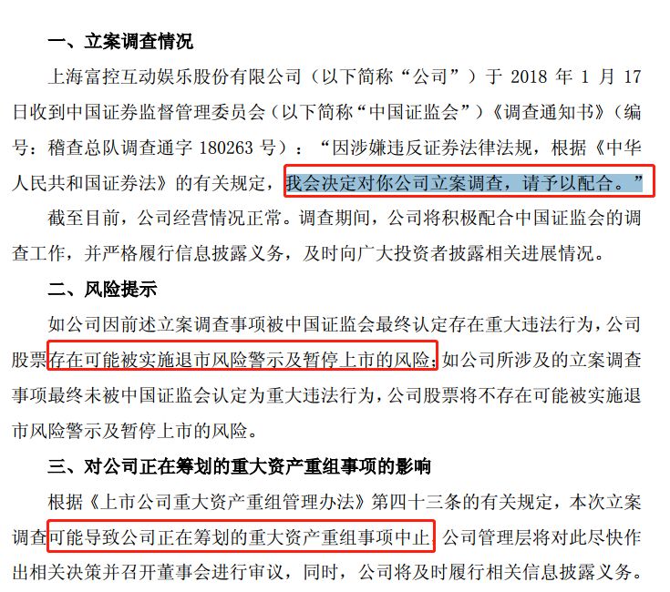 对于还在筹划重大资产重组的富控互动,立案调查还可能导致重大资产重组活动的中止。
