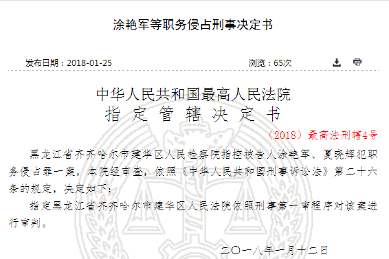 1月25日,和讯网获悉,涂艳军、夏晓辉犯职务侵占罪一案,已由最高人民法院指定黑龙江省齐齐哈尔市建华区人民法院依照刑事一审程序对该案进行审判。该指定管辖决定书公布的时间为2018年1月12日。