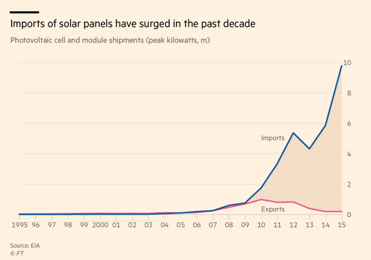 到1月底,特朗普必须决定是站在Suniva(该公司在破产几天后即发起贸易行动)一边,并对进口太阳能电池(多数来自中国)征收大范围关税;还是站在美国广大的太阳能行业一边,后者警告称这样的关税将导致消费价格上涨,并且,如果造成太阳能相比价格低廉的天然气等其他供电方案的竞争力降低,将损失成千上万的就业机会。