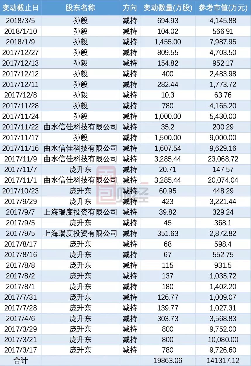 除了庞升东,事实上近年来公司实控人、董监高和多位重要股东都加入了减持行列中。先看2017年至今公司重要股东的买卖情况: