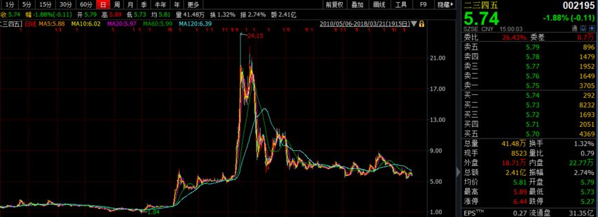 在2015年的那波中小创超级大牛市中,二三四五股价曾在几个月内,一度飙涨3.8倍,市值突破600亿元,站上历史巅峰。随着牛市的结束,股价不断下跌,至今仍然未恢复元气:截至2018年3月21日收盘,股价为5.74元,总市值为196亿元。与历史高点相比,已经蒸发了超过400亿市值。