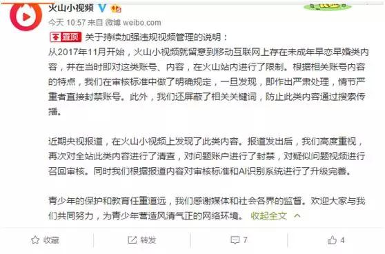 火山小视频今天上午也表态了,要对未成年早婚早恋内容进行清查,并表示平台其实早在去年就发现问题,并已经采取行动。