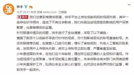 被点名的快手,凌晨紧急发出通告,针对报道中提及的问题,进行了全站清查,查删了数百个低龄怀孕视频,对个别影响恶劣的账号直接封号,并升级人工智能识别系统。