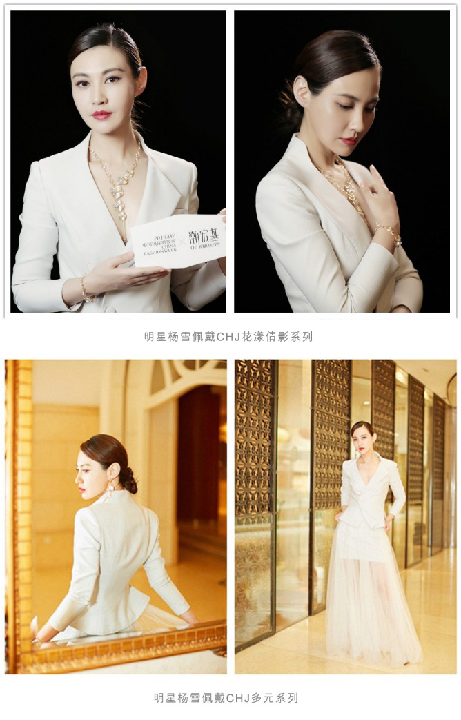 曾获电影频道传媒大奖最佳新人女演员奖的杨雪,穿着一席仙气飘飘的白色长裙搭配白色西装外套,佩戴CHJ花漾倩影系列的她,在立体镂空的花型的衬托下,更显雍容华贵。