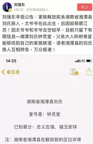 2018年1月2日,刘强东曾在微头条上发布寻祖公告, 称自己的家族解放前系湖南省湘潭县刘氏族人,太爷爷在湘潭出生,后因故全家移居江苏。