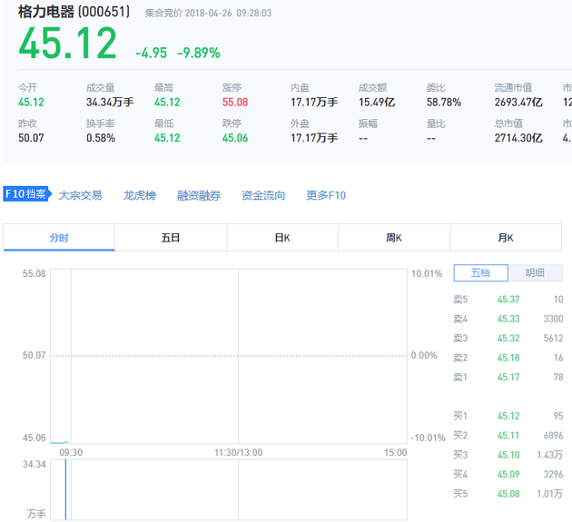 原标题:格力十一年来首次不分红 开盘逼近跌停 格力电器开盘大跌9.89%,成交量超30万手,成交金额