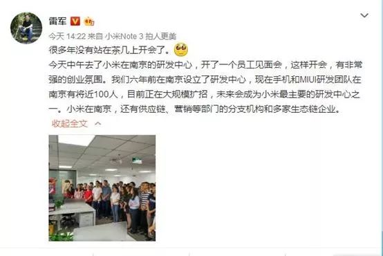 接下来是小米公司的全国研发中心:北京,南京,深圳‘。下图是雷军2017年10月9日在南京研发中心,当时已经有100人