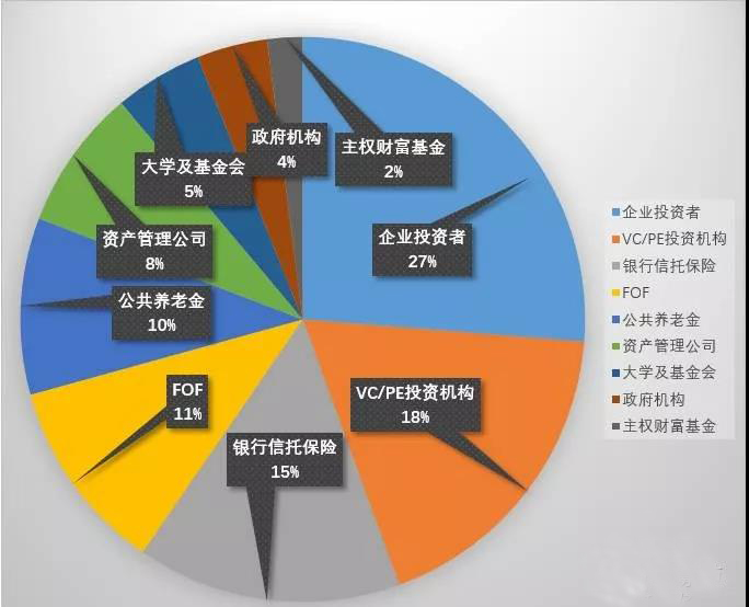 从这张图中,我们大致可以看到LP的主要类型包括企业投资者、VC/PE投资机构、政府机构、银行保险信托、资产管理公司、引导基金、FOF、大学及基金会、主权财富基金、家族基金、公共养老金等。然后我们再比较一下境内LP类型分布及境外LP类型分布: