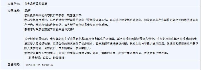 31日,蓝鲸产经记者浏览重庆市食药监局官网时,重庆市食品药品监管局公开信箱更新了调查进展情况并公开回复举报人信息,表示“我局组织的主要由国家药品GMP检查员组成的调查组,正对举报的问题开展深入调查;驻局纪检监察组对举报反映的我局监管人员接受吃请、收受红包的情况进行了初步核实,暂未发现有违法违纪问题;积极主动与举报人进行联系,但发现其所留信息不是举报人真实信息,目前我们一直未能联系上实际举报人。”