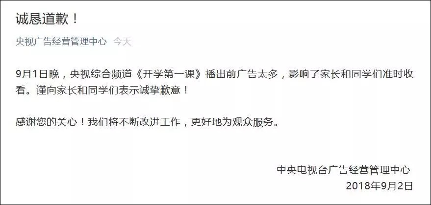 9月2日,中央电视台广告经营管理中心发布公告,就《开学第一课》播出前广告太多进行了道歉。