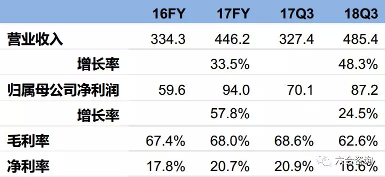 公司收入增长迅猛,带动净利持续提升。总收入:2016~2017财年、2018财年前9个月分别为3.3亿、4.5亿(+33.5%)、4.9亿(+48.3%);归属母公司净利润:2016~2017财年、2018财年前9个月分别为0.60亿、0.94亿(+57.8%)、0.87亿(+24.5%);毛利率:2016~2017财年、2018财年前9个月分别为67.4%、68.0%、62.6%;净利率:2016~2017财年、2018财年前9个月分别为17.8%、20.7%、16.6%。
