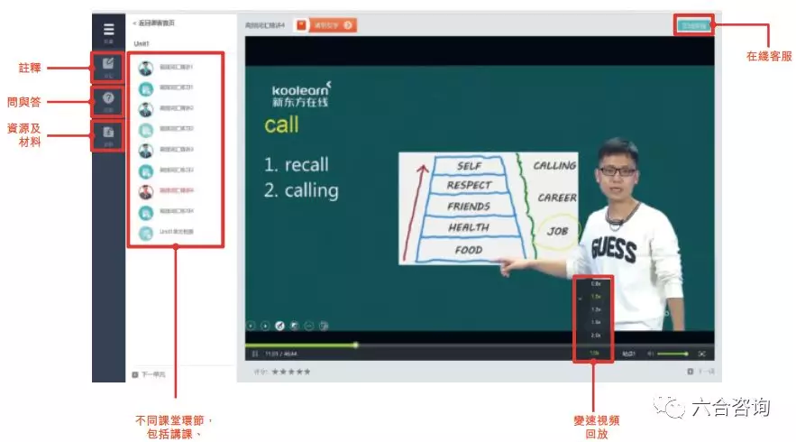 公司与新东方集团合作,向学生提供线上私播课程,补充新东方集团线下教学。公司为无新东方学校地区学生、修完新东方线下课程后,有意继续线上学习的学生,提供私播课,以录播视频课程为主。公司聘用新东方教师,利用公司平台及技术,设计、录制私播课课程,与教师分成。平台私播课涵盖初中到高中所有主要科目,包括系列20~30分钟视频,巩固特定科目知识要点,学生可利用课余时间通过电脑或手机观看。