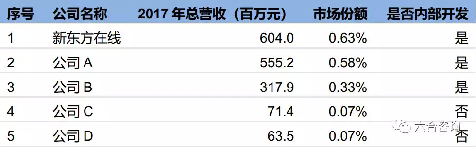 中国整体在线课外辅导及备考市场高度分散,头部公司市场占有率低。2017年前五大综合在线教育公司总营收为16.1亿,占中国在线课外辅导及备考市场1.67%。公司公告披露2017年自然年度(截至12月31日止未经审计)总营收6.04亿,市场份额占比0.63%。