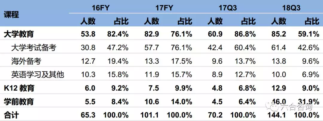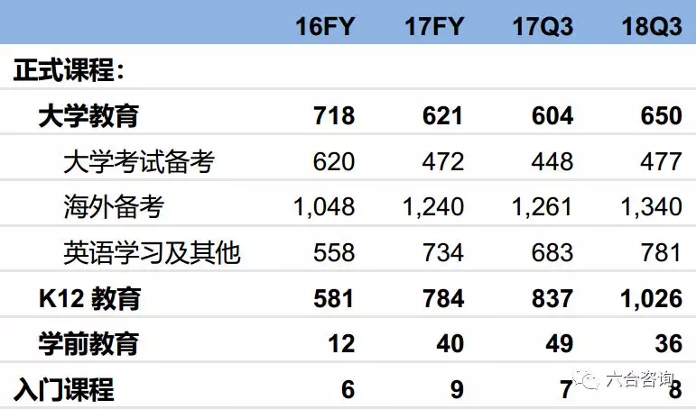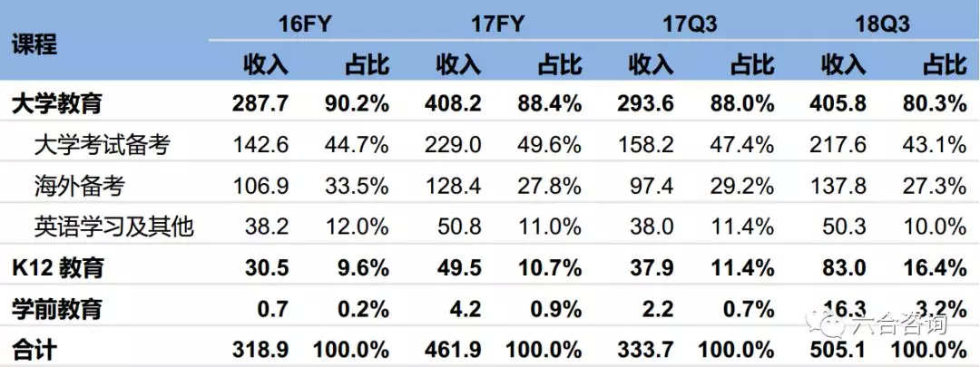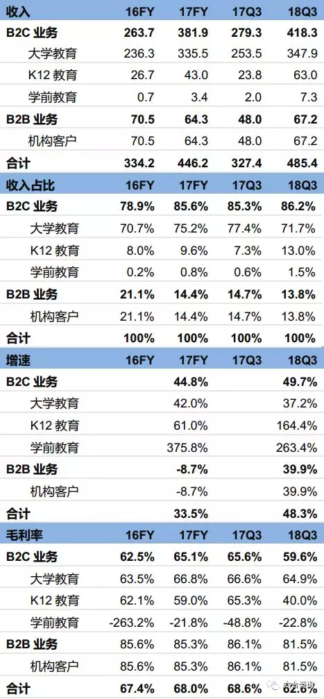 大学教育:公司核心业务。2016~2017财年、2018财年前9个月,该业务收入分别为2.4亿、3.4亿(+42.0%)、3.5亿(+37.2%),毛利率分别为63.5%、66.8%、64.9%。