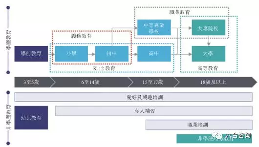 中国教育体制可分为学历教育及非学历教育。学历教育,主要包括学前教育、覆盖中小学教育的基础教育(统称K12教育)、大学教育、职业教育(中专、大专院校)。非学历教育,主要包括私人补习、幼儿教育、爱好及兴趣培训、职业培训、高等非学历教育等。