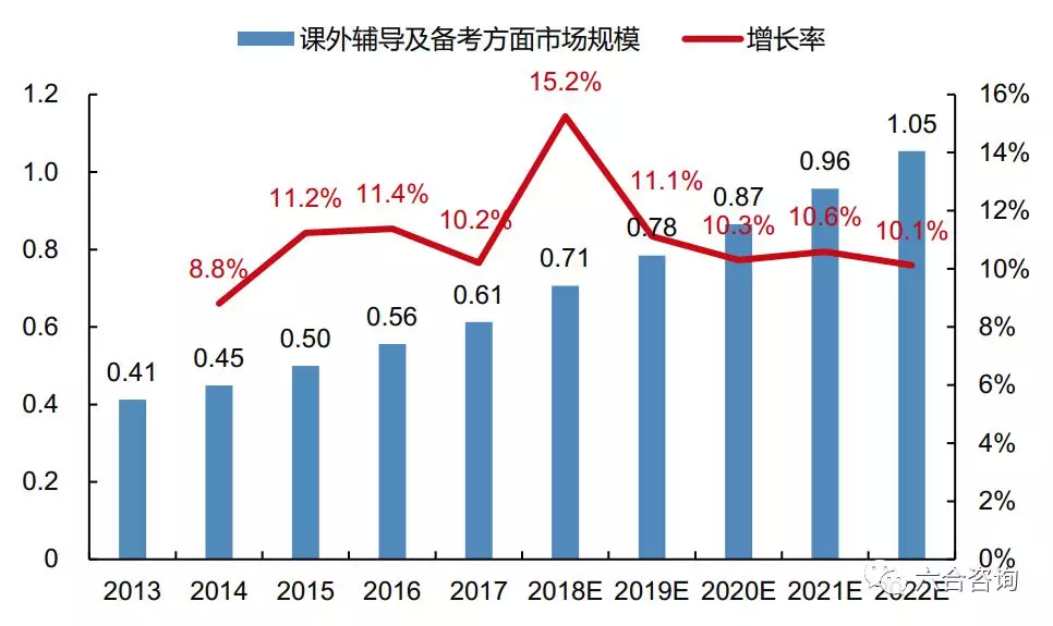 2013~2022年中国课外辅导及备考市场规模与预测(单位:万亿)